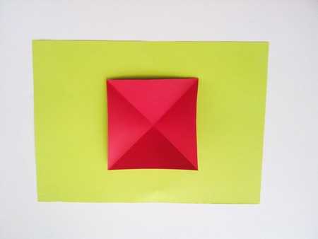 Вырежьте квадратик из красной бумаги. Наметьте линии сгиба, согнув и разогнув его по двум диагоналям.