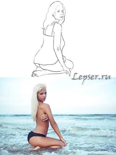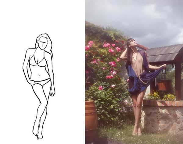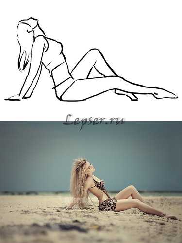 Для этого фона прекрасно подойдут позы с опорой на что-нибудь: камни, песок, шезлонг и т. д. Или же позиция «Дефиле» с уходящей в море и закат прекрасной нимфой.