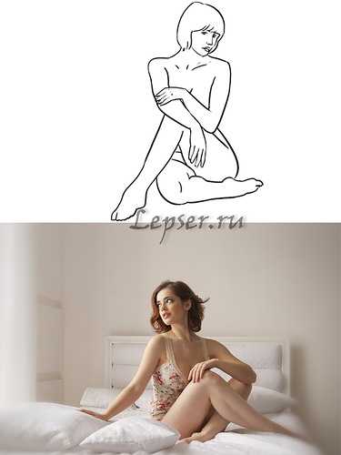- Сядьте на пол под прямым углом к объективу, согните ноги в коленях и плотно соедините между собой, руками обопритесь на любой подходящий предмет, а завлекающий взгляд направьте в камеру из-за плеча;