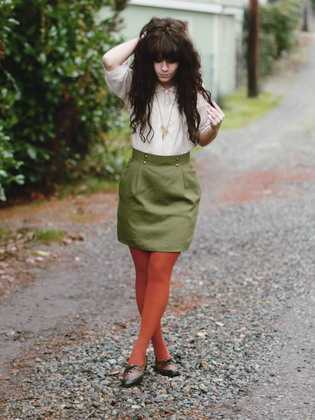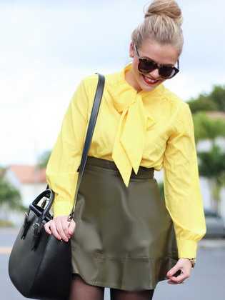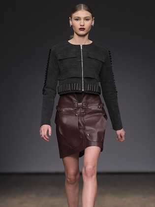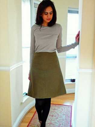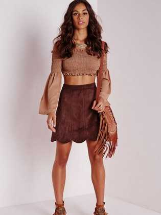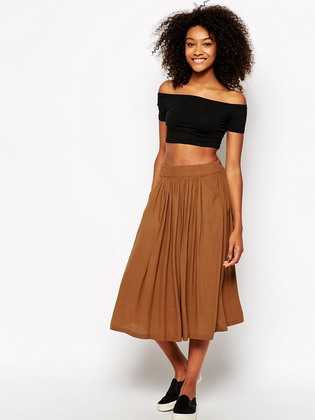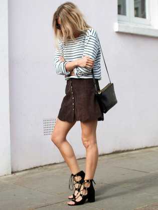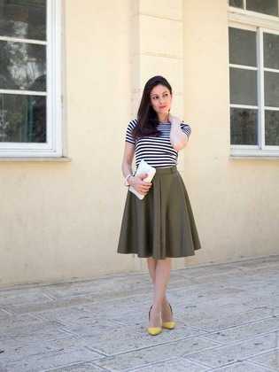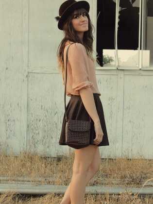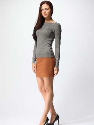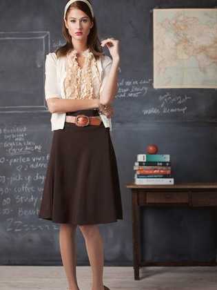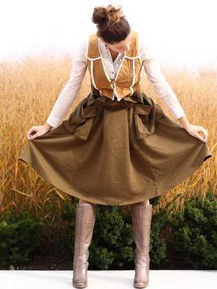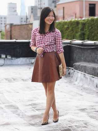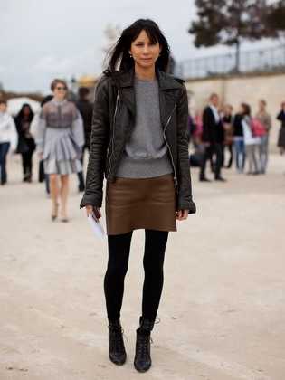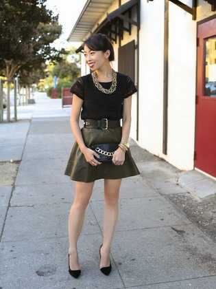 Если позволяет возраст, рассмотрите кожаную юбку-клёш темно-серого, почти черного цвета, высокие коричневые сапоги, небольшую сумку и украшения.
