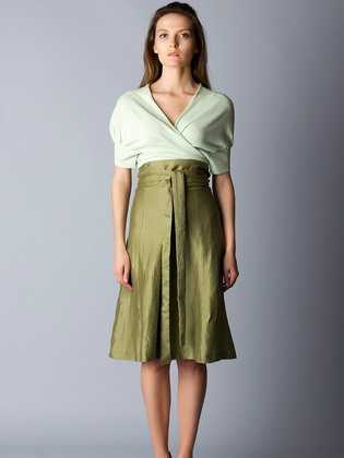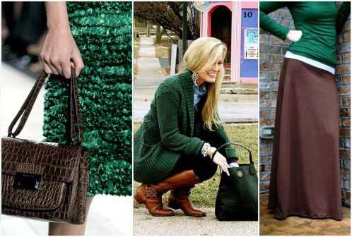Идеально выглядит этот цвет с зеленым. Жизнерадостные зеленые оттенки добавят образу свежести, гармонии и комфорта. Только следите, чтобы коричневого было больше, а зеленого – меньше. Дополнить можно простыми, легкими аксессуарами. Такое сочетание подходит для любых встреч, кроме работы со строгим дресс-кодом.