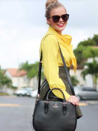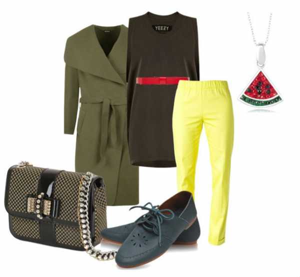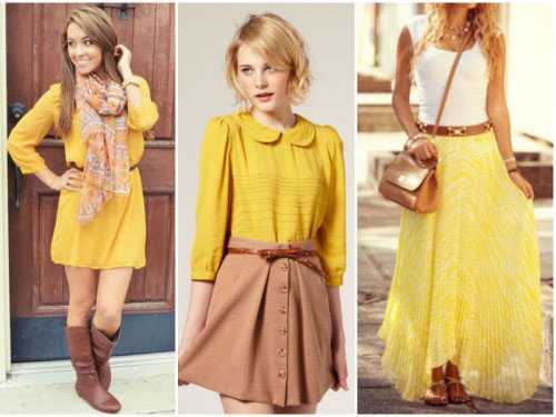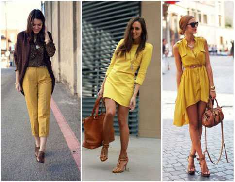 Трудно представить более теплое и солнечное сочетание коричневого цвета в одежде, чем соединение с желтым оттенком. В целом данные цвета достаточно близки и они лежат на одном круге, потому лучше не брать слишком яркий желтый цвет, а подбирать все же более светлые и даже слегка размытые оттенки. Если вам не нужно никого шокировать своей эпатажностью и вызывающим видом, то мягкий образ будет как раз со спокойным желтым оттенком, который будет доминирующим цветом и дополнить его слегка коричневыми вставками или аксессуарами (пояс, сумка, шарф).