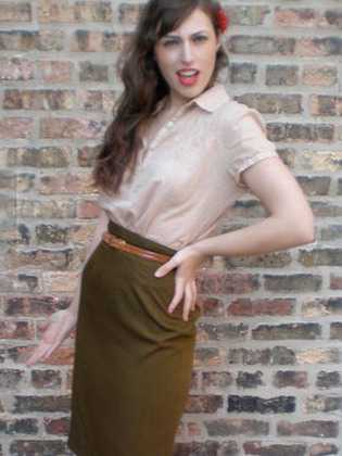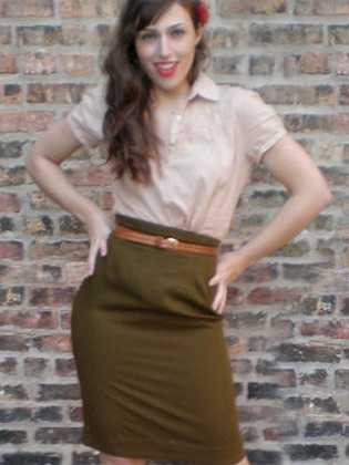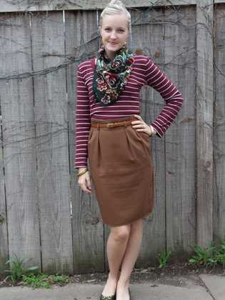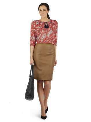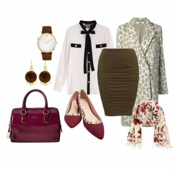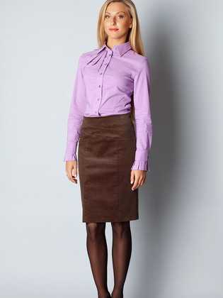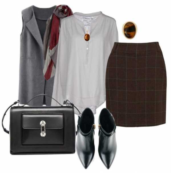Юбка-карандаш темно-коричневого оттенка + серая блузка. Дополните композицию серебряными маленькими сережками и красивыми часами. Такая одежда подчеркнет Вашу респектабельность.