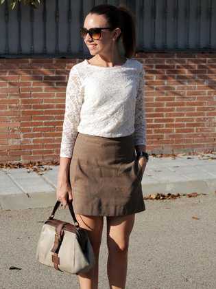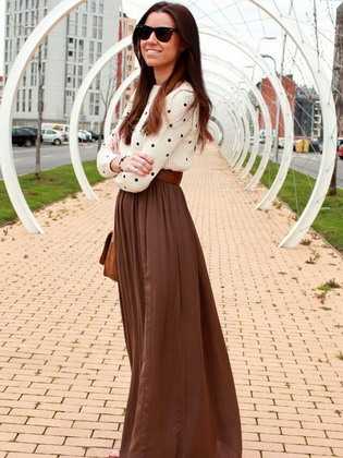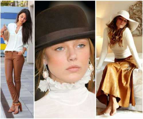 Классический белый цвет подходит к любым вещам и потому является универсальным, если сочетать белую блузку с коричневой юбкой, то дует получиться привлекательным и гармоничным. Белый таит в себе нежность, чистоту и свежесть, а вот коричневый цвет добавляет немного мрачности и печали. В этом сочетании следует либо брать одинаковое количество темного и светлого, или добавить больше белого, чтобы он доминировал. Если разбавить наряд дополнительным цветом – золотой, желтый или бирюзовый – то будет весьма необычно и элегантно.