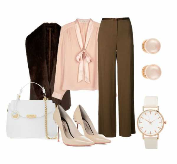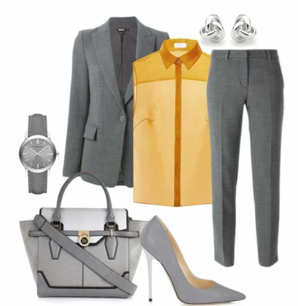 Для деловых встреч подойдет сочетание в классическом стиле. Старайтесь выбирать одежду простого, строгого кроя. К примеру, серый брючный костюм + темно-бежевая рубашка. Аксессуары подойдут прямоугольной формы, можно даже надеть лакированные туфли и взять такую же сумку.