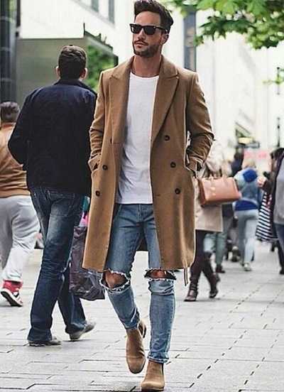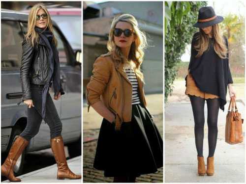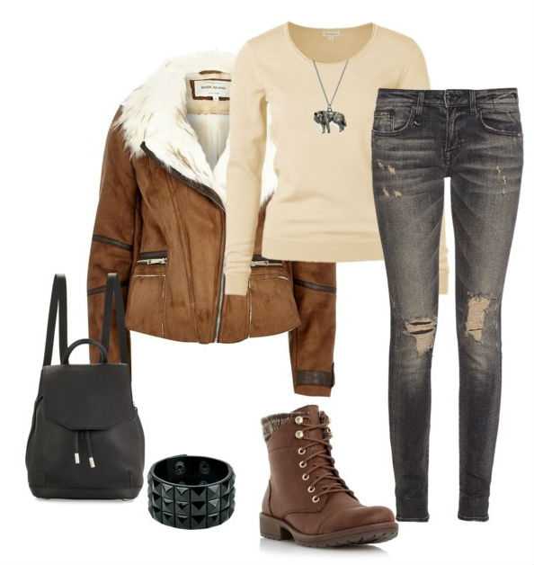 - естественный и классический вариант — деним с коричневыми кожаной курткой и ботинками.
