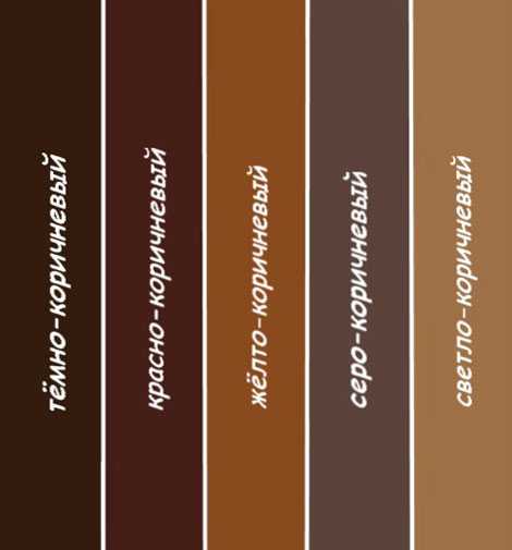 Коричневые оттенки разделяют на темные и светлые, каждый из которых холодный (имеет серый или зеленый отлив) или теплый (с добавлением желтых красок).