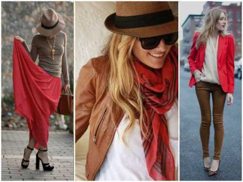 Резкий и контрастный красный цвет сочетает в себе страсть, любовь и сильную энергетику. Но если добавить к нему коричневый, то яркость немного тускнеет и образ уже получается достаточно спокойным. Можно разбавлять красный белым оттенком в виде аксессуаров.