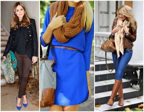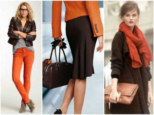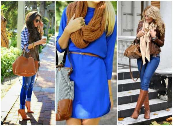 Сочетание медно-коричневого с синим и другими цветами в одежде