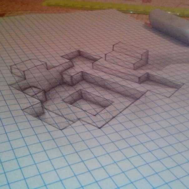 Намного проще создавать трехмерный рисунок по клеточкам. Из материалов для такого творчества потребуется лишь лист из тетради в клеточку и ручка/карандаш. Польза от такого творчества огромная. Рисование не только снимает напряжение, но и развивает внимание и мышление.
